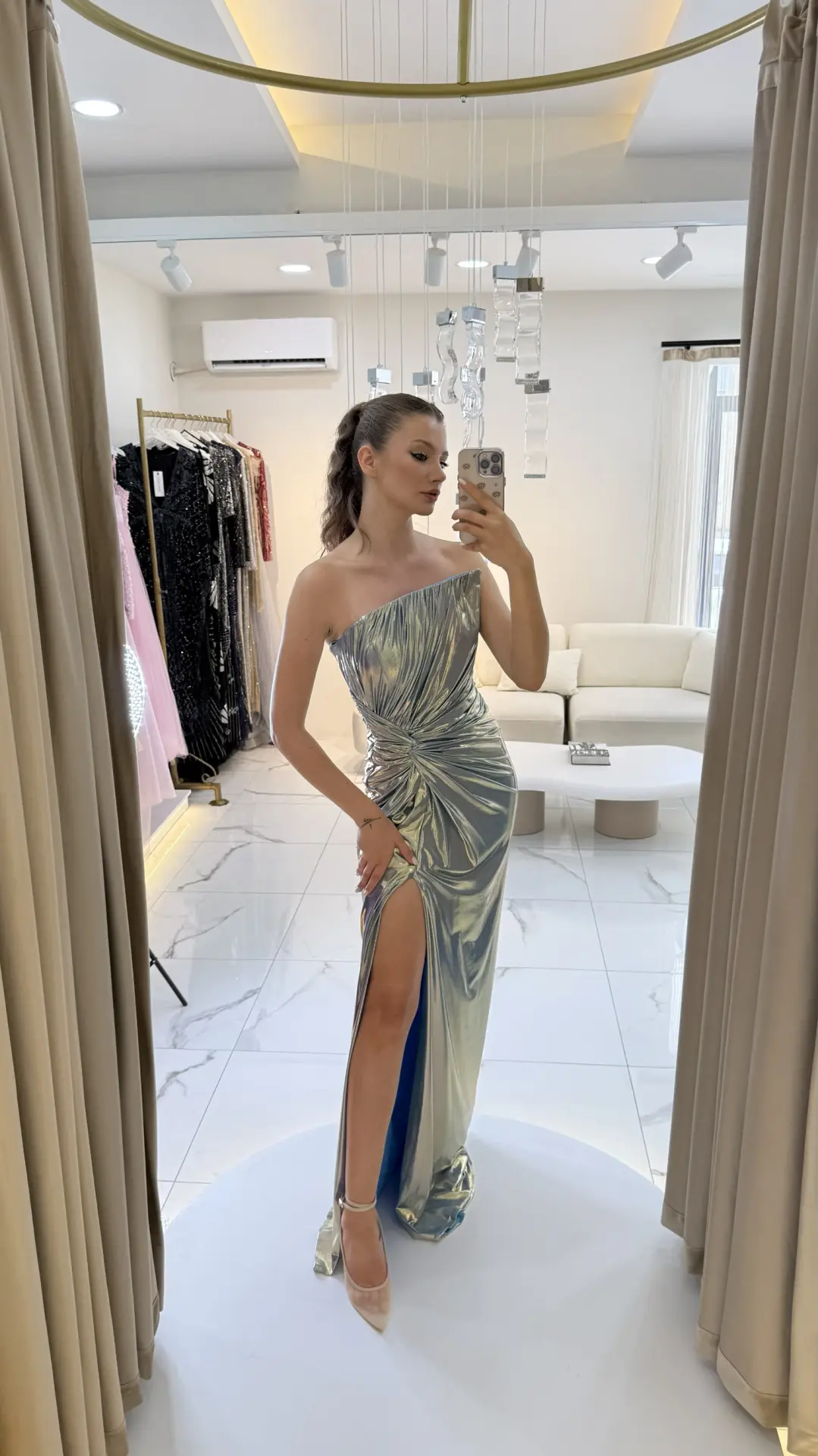 Metalik Gümüş Straplez Drapeli Yırtmaçlı Abiye
