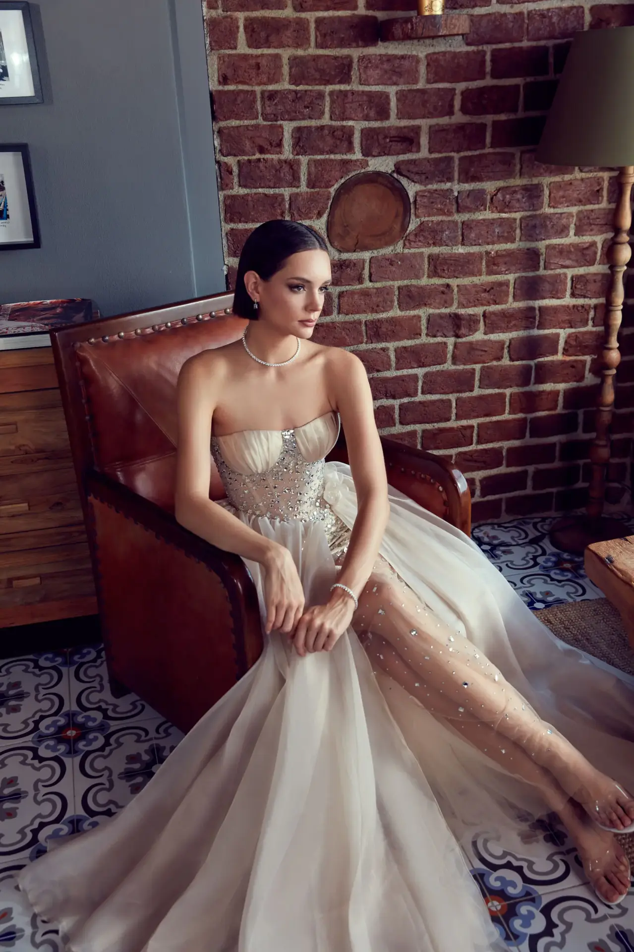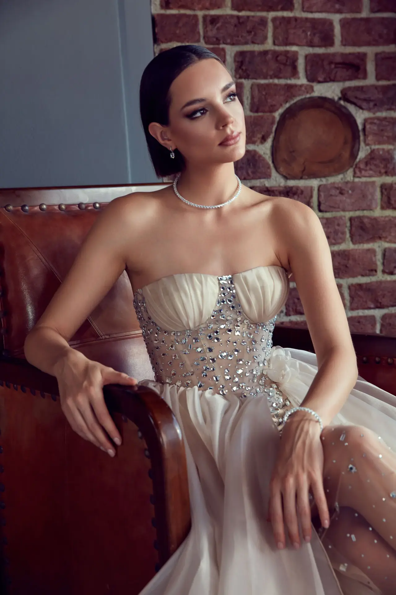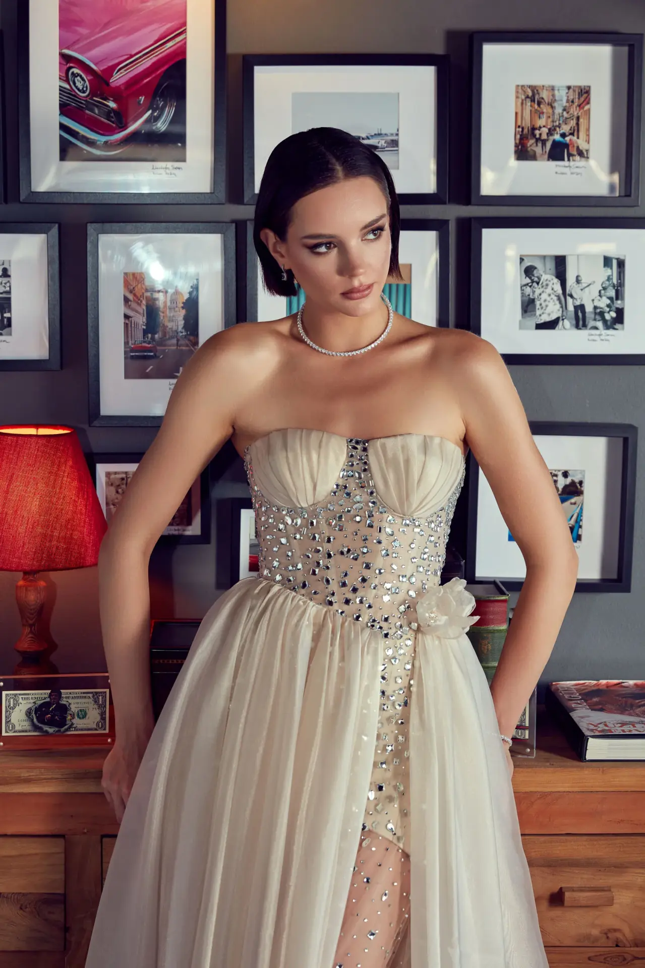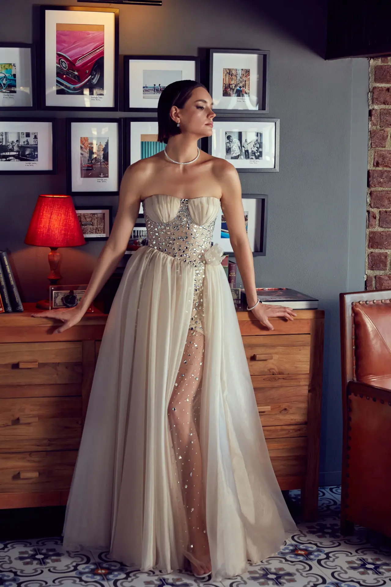 Straplez Krem Taş İşlemeli Tül Abiye Elbise